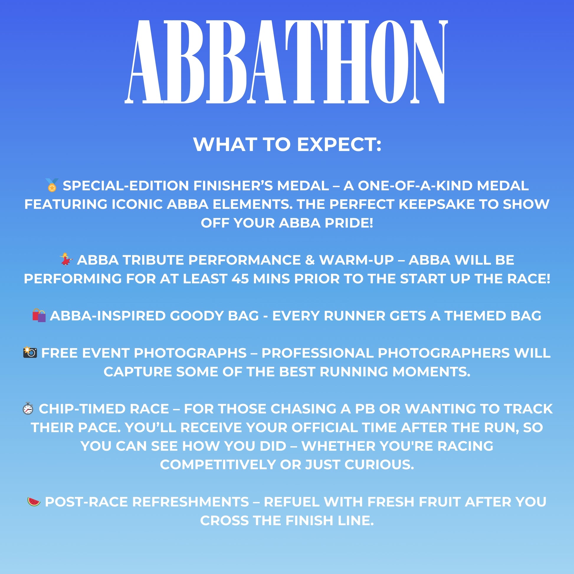 🏅 Special-Edition Finisher’s Medal – A one-of-a-kind medal inspired by iconic ABBA elements. The perfect keepsake to show off your ABBATHON pride!